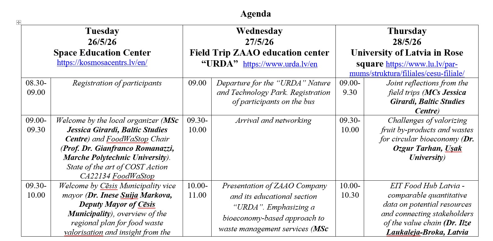 For participants invited from the COST Action CA22134 FoodWaStop budget, the cost of participation will be reimbursed according to COST rules after daily signature of the attendance list at the Training School and submitting the reimbursement claim form on e-COST once back at home. Participants need to book their own accommodation and cover food costs (except for snacks at the coffee breaks), with a fee of 20 Euro per day for lunches, while the group dinner is optional